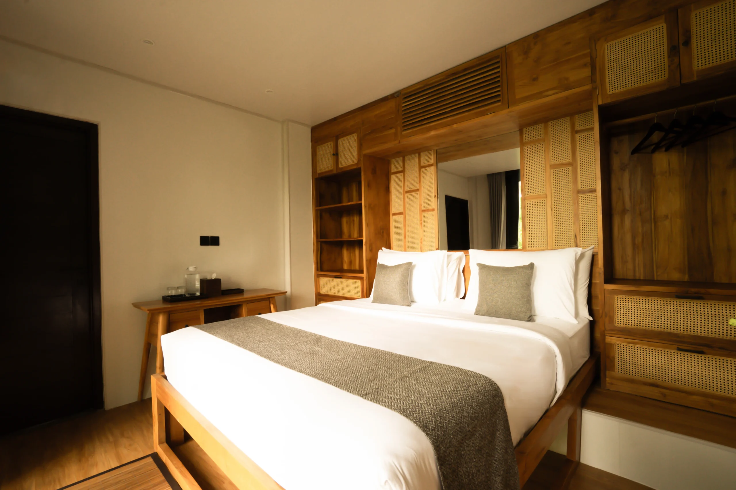 Designed with warmth and ease in mind, the Two Bedroom Apartment Balcony blends contemporary style with the relaxed spirit of Balinese living. The layout offers a plush king bedroom for restful nights, complemented by a bright twin room ideal for families or friends. A spacious living area invites slow mornings and cosy evenings, while the kitchen and dining space make shared meals simple and enjoyable. The semi–outdoor bathroom adds a subtle touch of nature to your routine, and the private balcony becomes your personal corner for fresh air and quiet reflection. With full air-conditioning throughout, this apartment provides a cool, comforting, and beautifully curated refuge for your island stay.
